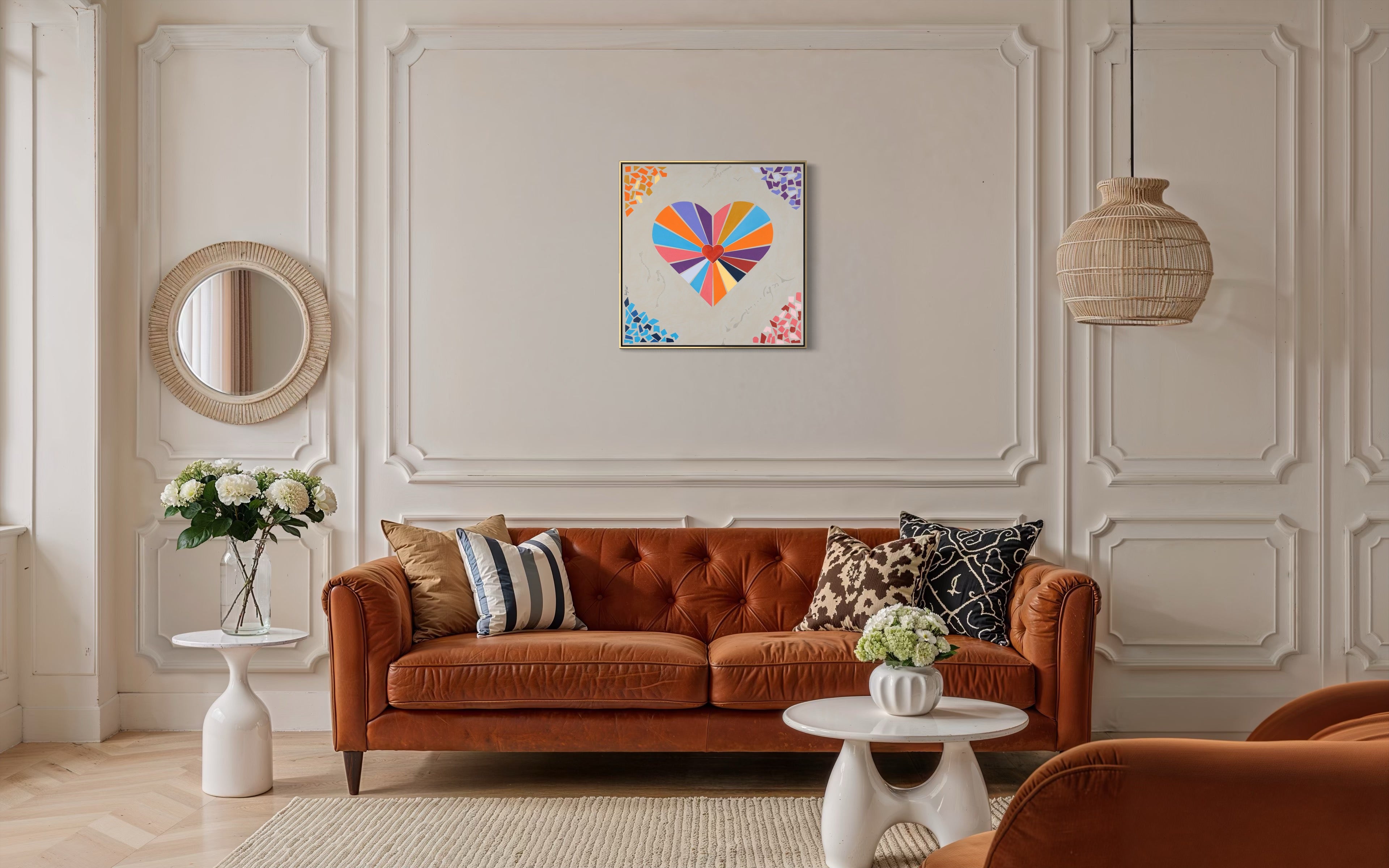 Barcelona is a vibrant city, known for its wonderful location along the Mediterranean Sea but also as an incredibly active art scene. I spent a few days there last year to breathe that atmosphere and get inspired. This painting is about the rich colors, the history, the fine jewelry, and the Gaudi legacy. It radiates from its center and I hope you will feel the warmth that I felt walking around the streets of this magnificent city.