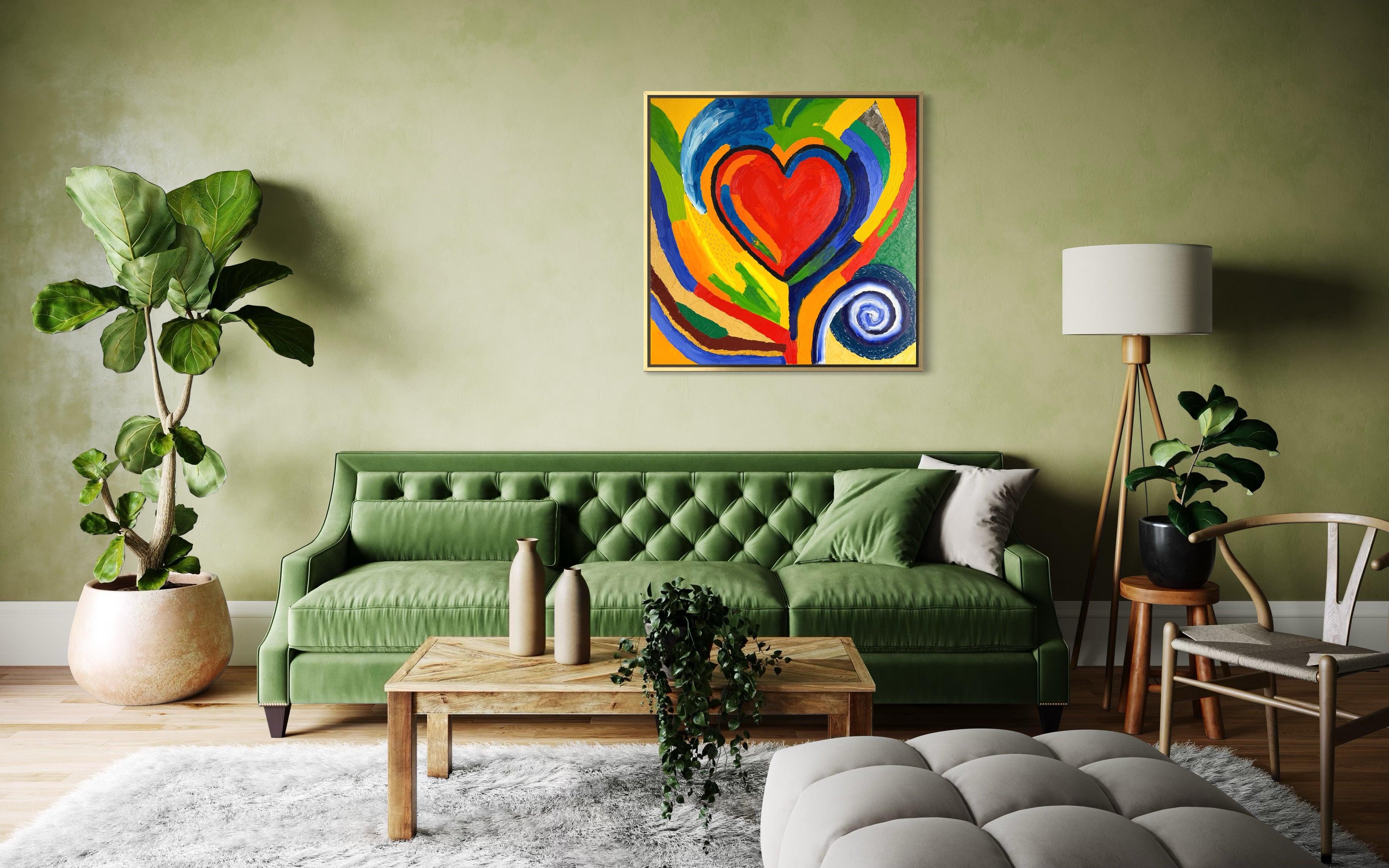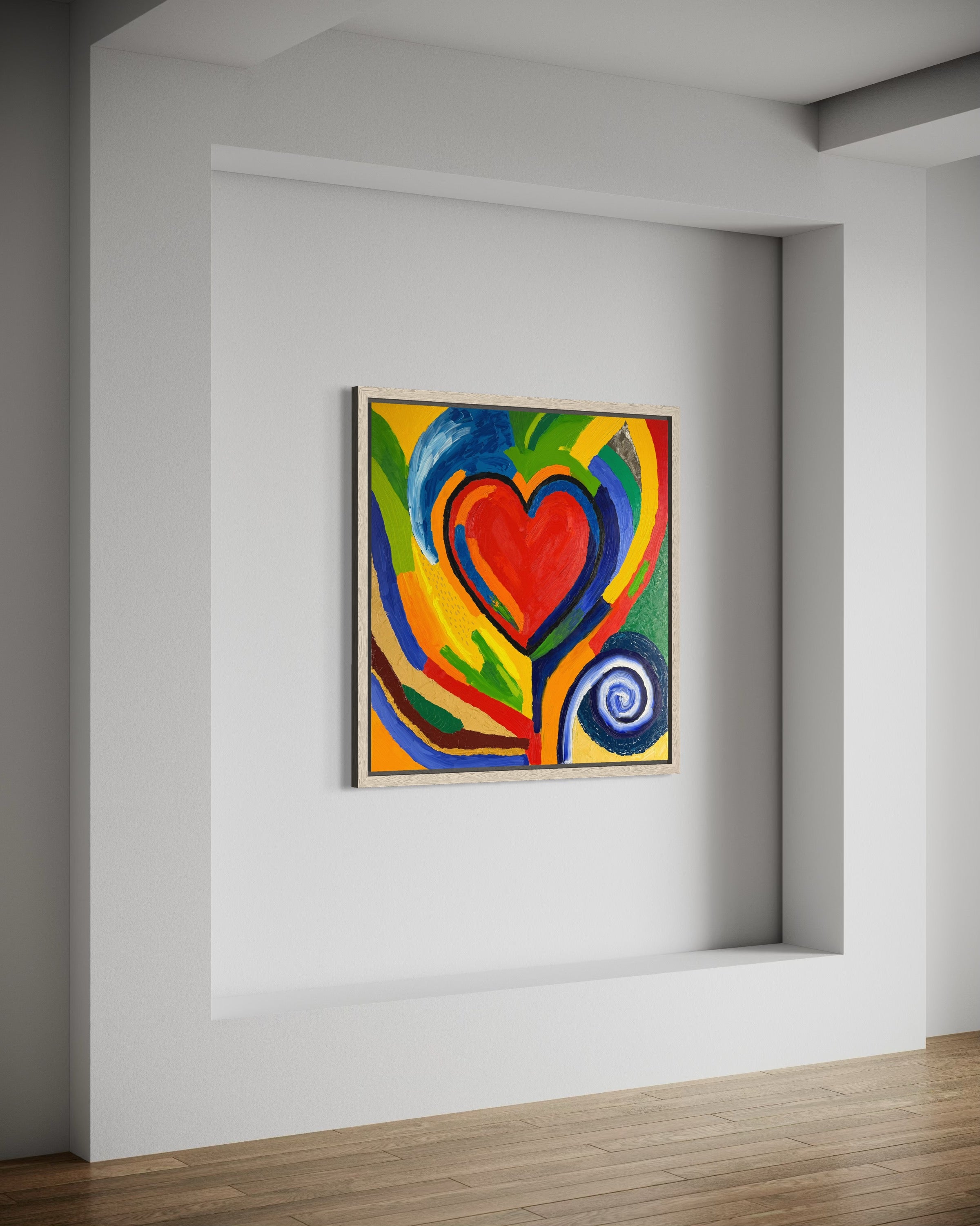 Painted entirely with a palette knife, California is a vivid, textured memoryscape—100 cm by 100 cm of emotion in motion. At its center, a red heart pulses outward, wrapped in bands of saturated color that ripple like heatwaves. It is full of movement. A swirl spins in the corner like a sun or a dream or a hurricane, while fragments of green, blue, sand, and earth hint at mountains, coastlines, forests, and desert skies. This is not a place—it’s a feeling.