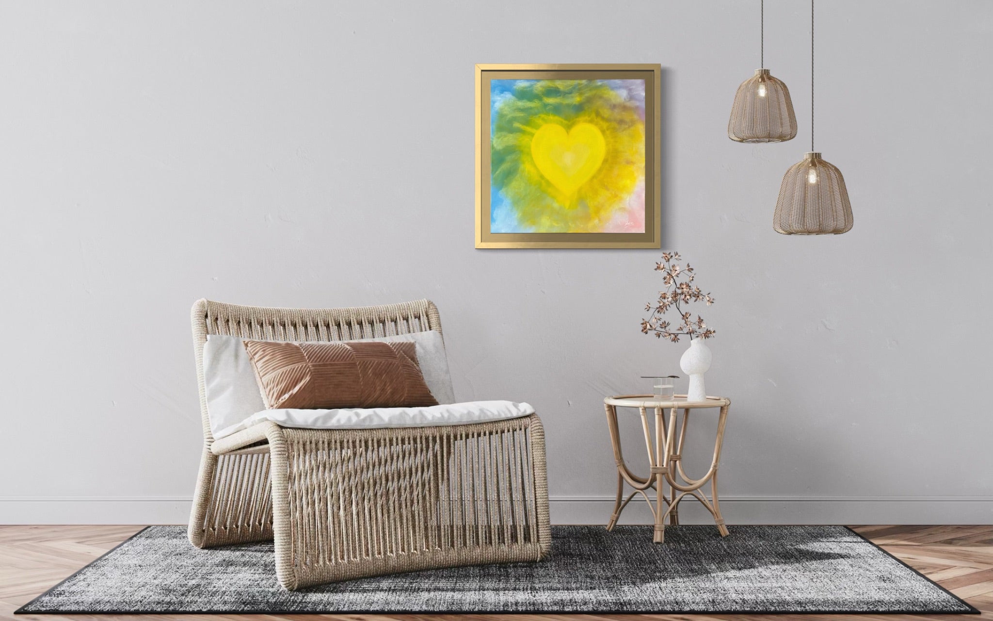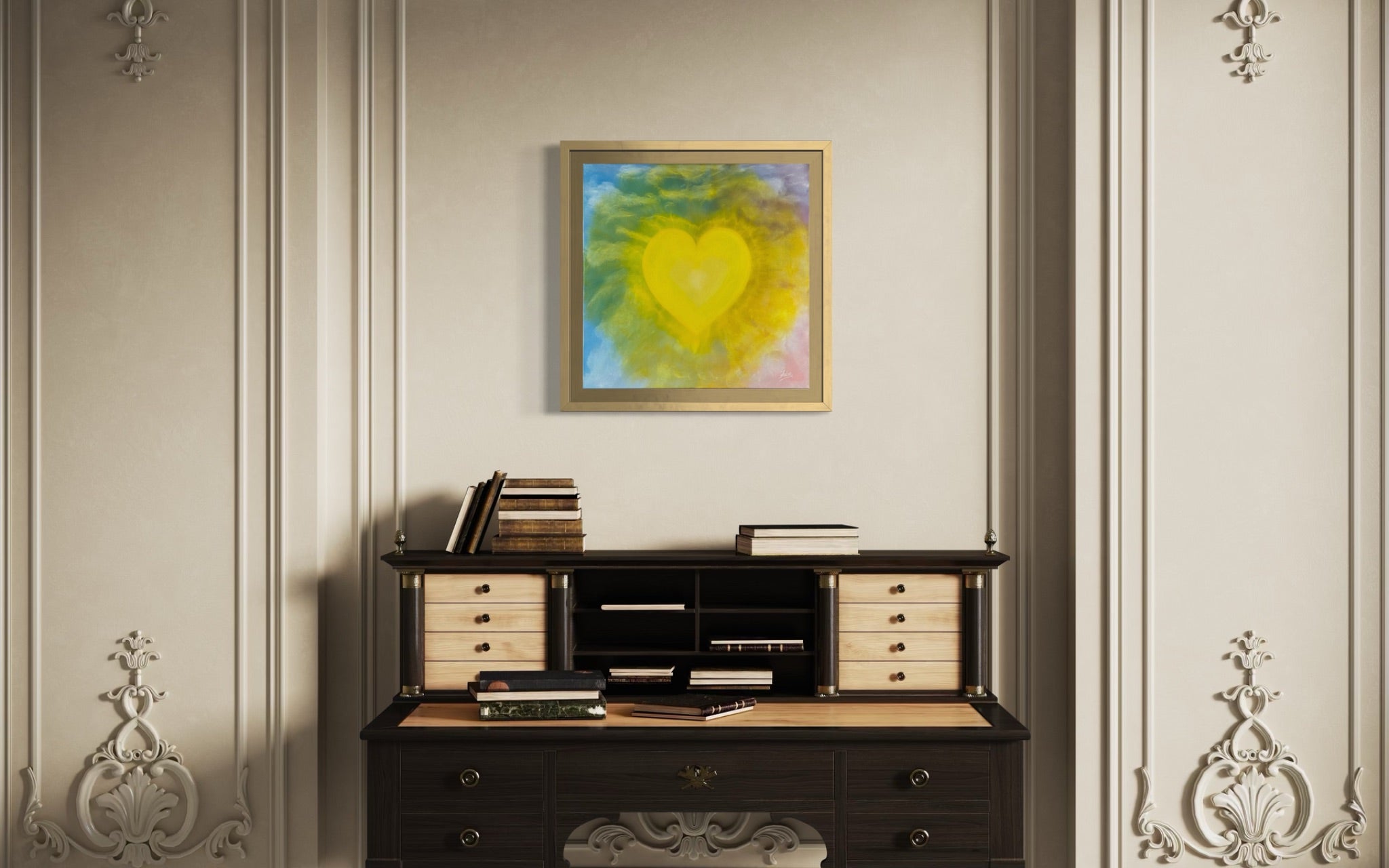 A heart-shaped sun pulses at the center of a glowing sky, radiating light that feels more emotional than physical. Built from subtle transparencies and soft gradients, this piece invites you not just to see warmth—but to feel it. It’s less a painting than a presence: calm, powerful, and gently overwhelming. Like love itself, it doesn't ask for attention—it gives.