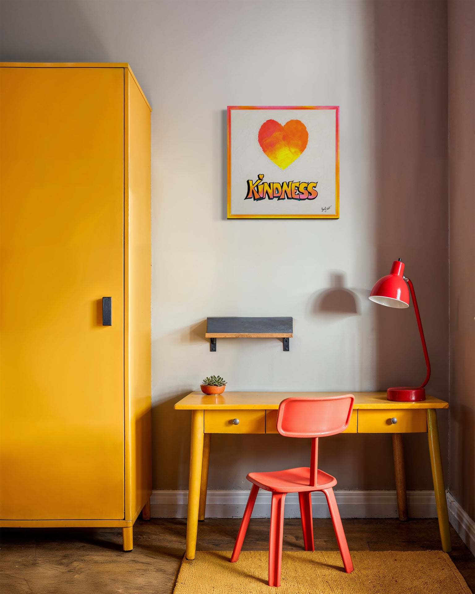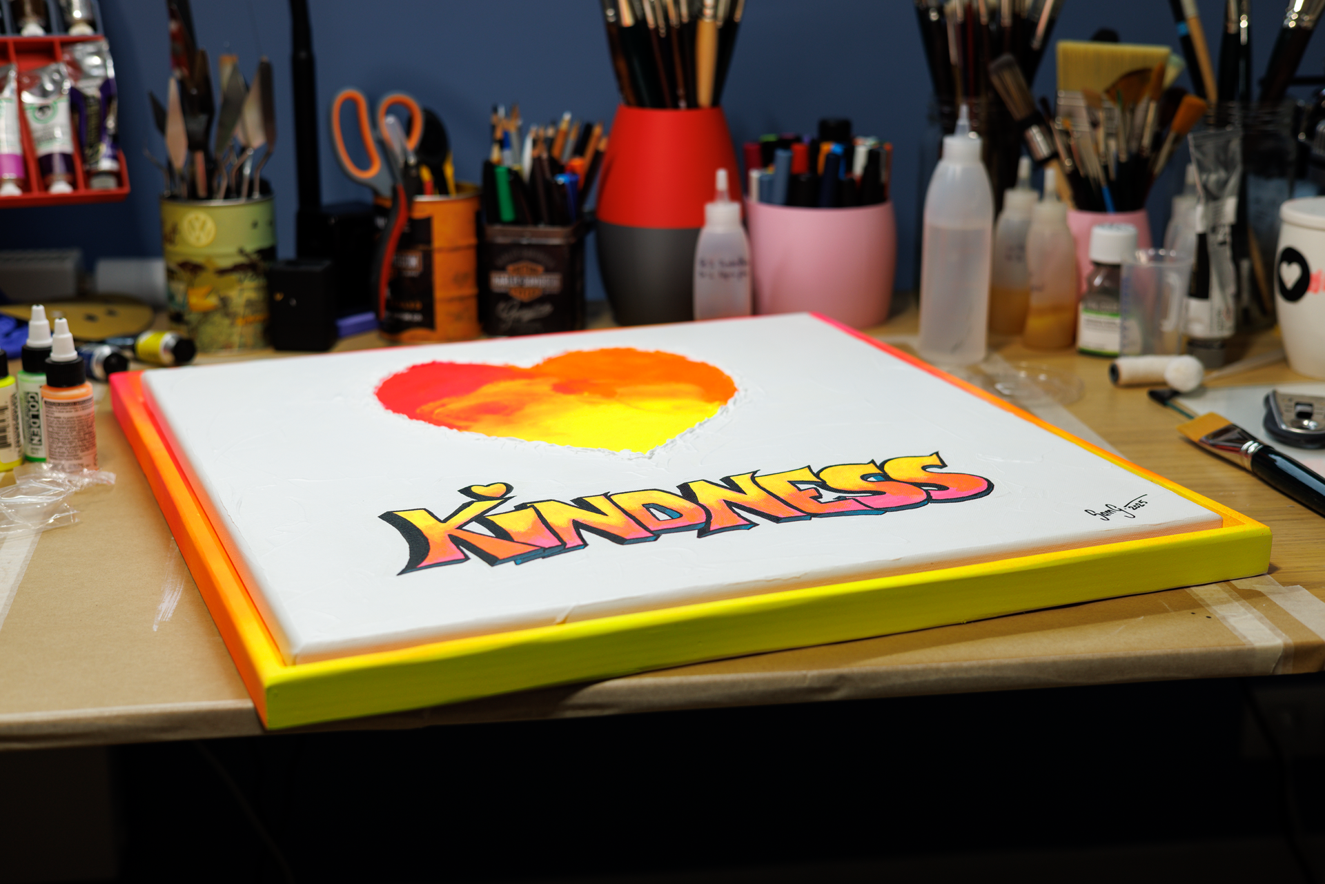 This painting was born from a sensory memory — the sound of 80s music echoing through the narrow streets of Lisbon, where every corner seems to hum with nostalgia and bold, vibrant life. The heart, in glowing gradients of orange and yellow, is intentionally surrounded by a gritty, three-dimensional edge built with modeling paste — a tactile nod to the texture and resilience of the city itself. It’s not a clean, polished shape; it’s worn, weathered, radiant — like Lisbon.