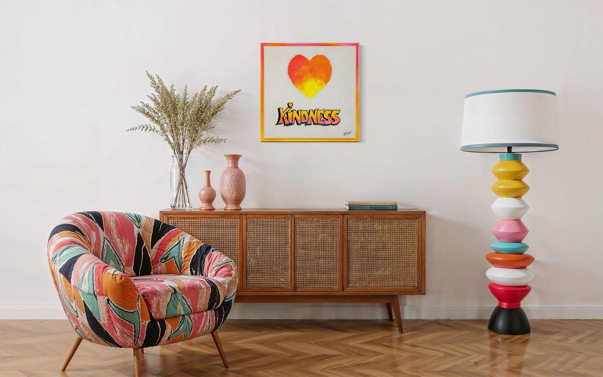The use of fluorescent colors is a direct reference to the neon-soaked atmosphere conjured by the music and the sun-washed architecture. Below, the word “Kindness” is hand-painted in a playful graffiti style, inspired by the countless murals and street tags that fill Lisbon’s walls with messages of love, protest, and hope. That one small heart nestled above the “K” — it’s not decoration. It’s a statement.