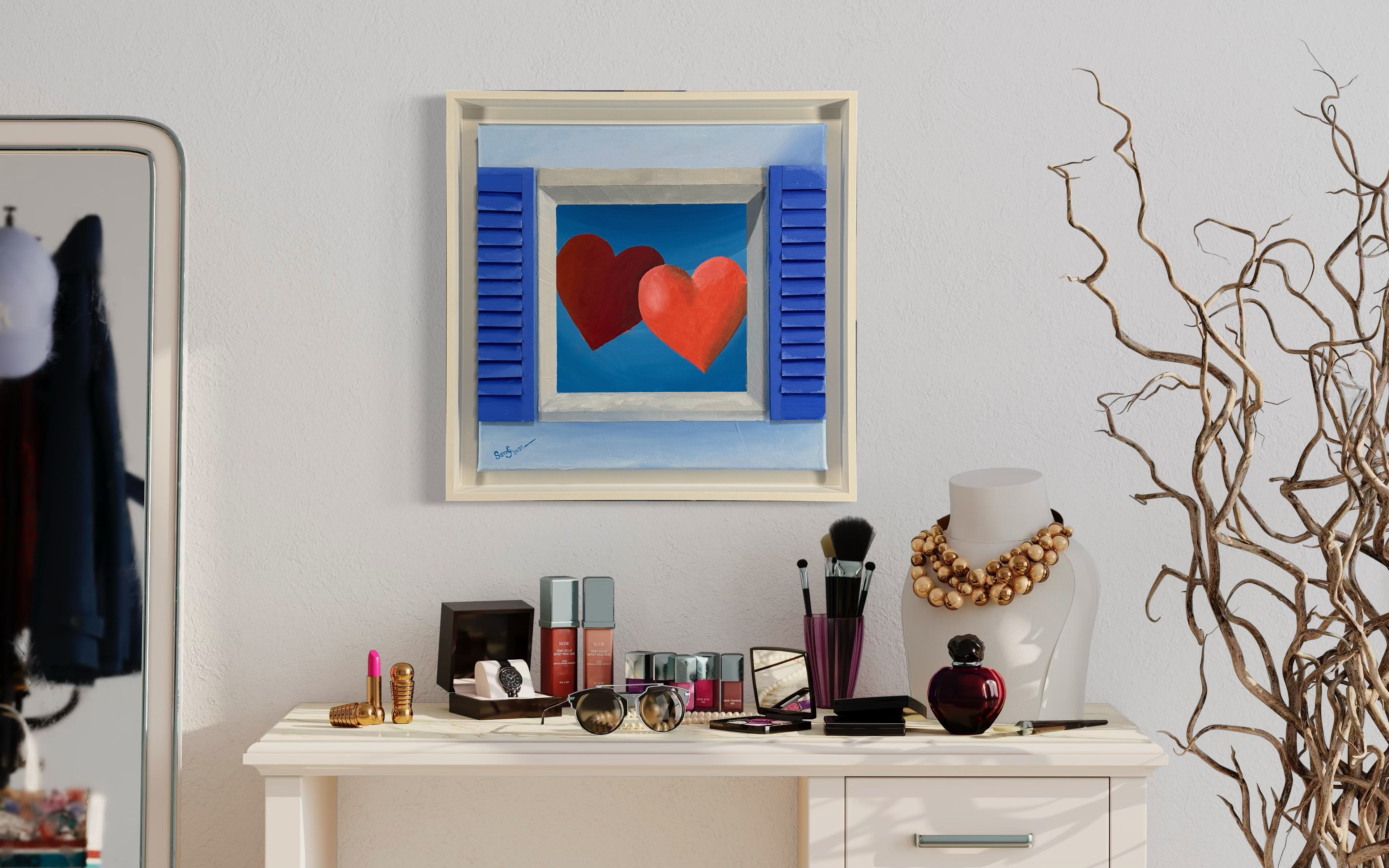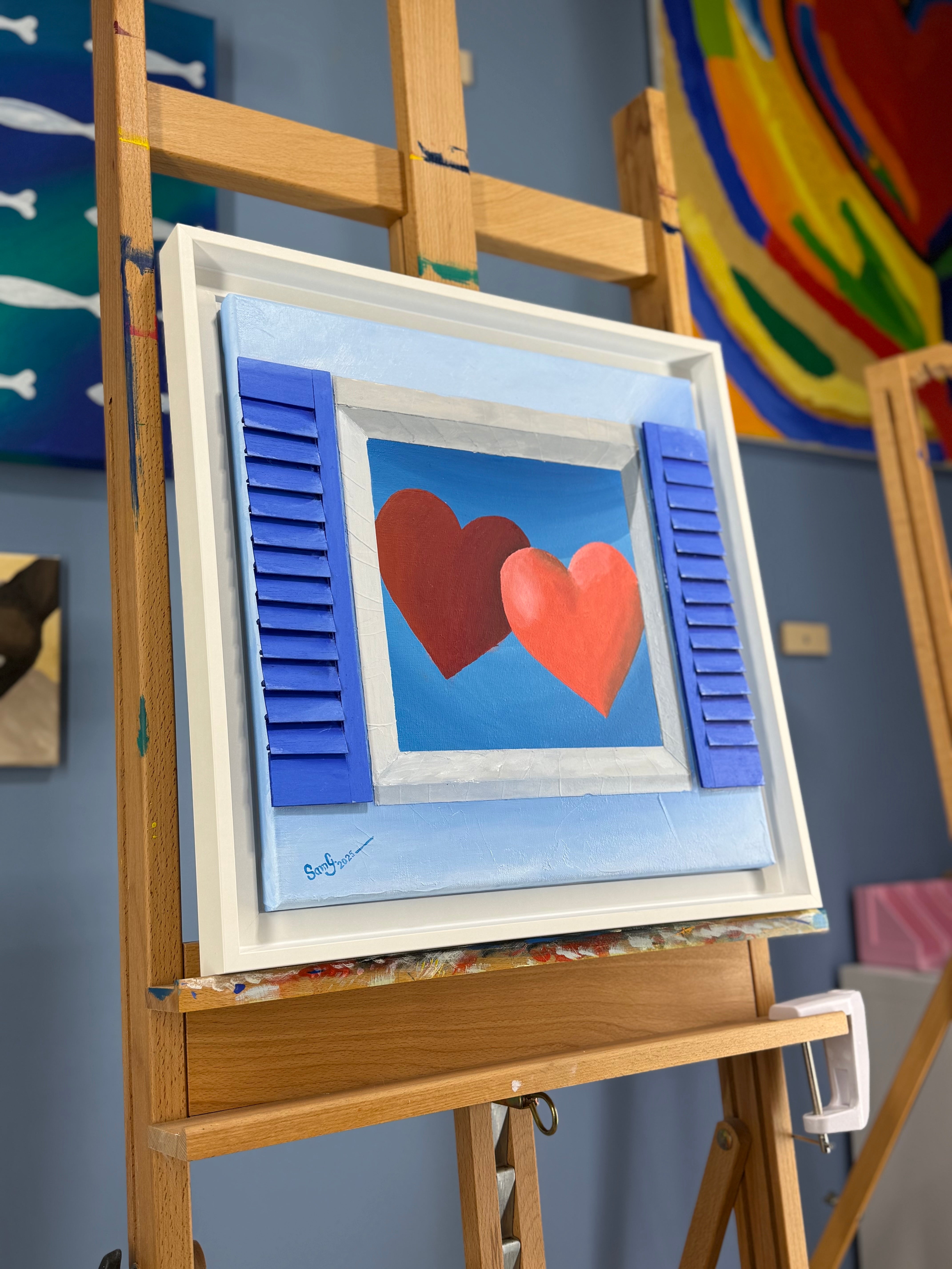 Two hearts hover in a sunlit window, side by side but not quite touching. The frame is soft blue, the shutters a bold Mediterranean indigo—real wood, sculpted and painted by hand. This isn’t just a painting; it’s an object. The kind you’d find walking down a narrow Italian street, where the air smells like stone and sea and the past is never far. The colors are vivid, the architecture imperfect, the light honest. And in the middle of it all—love.