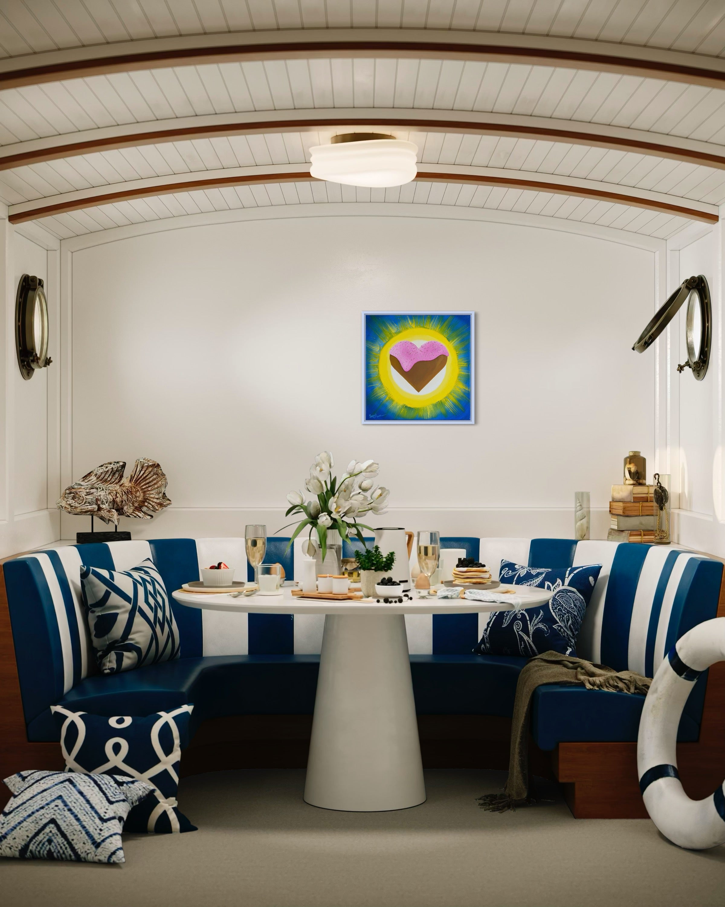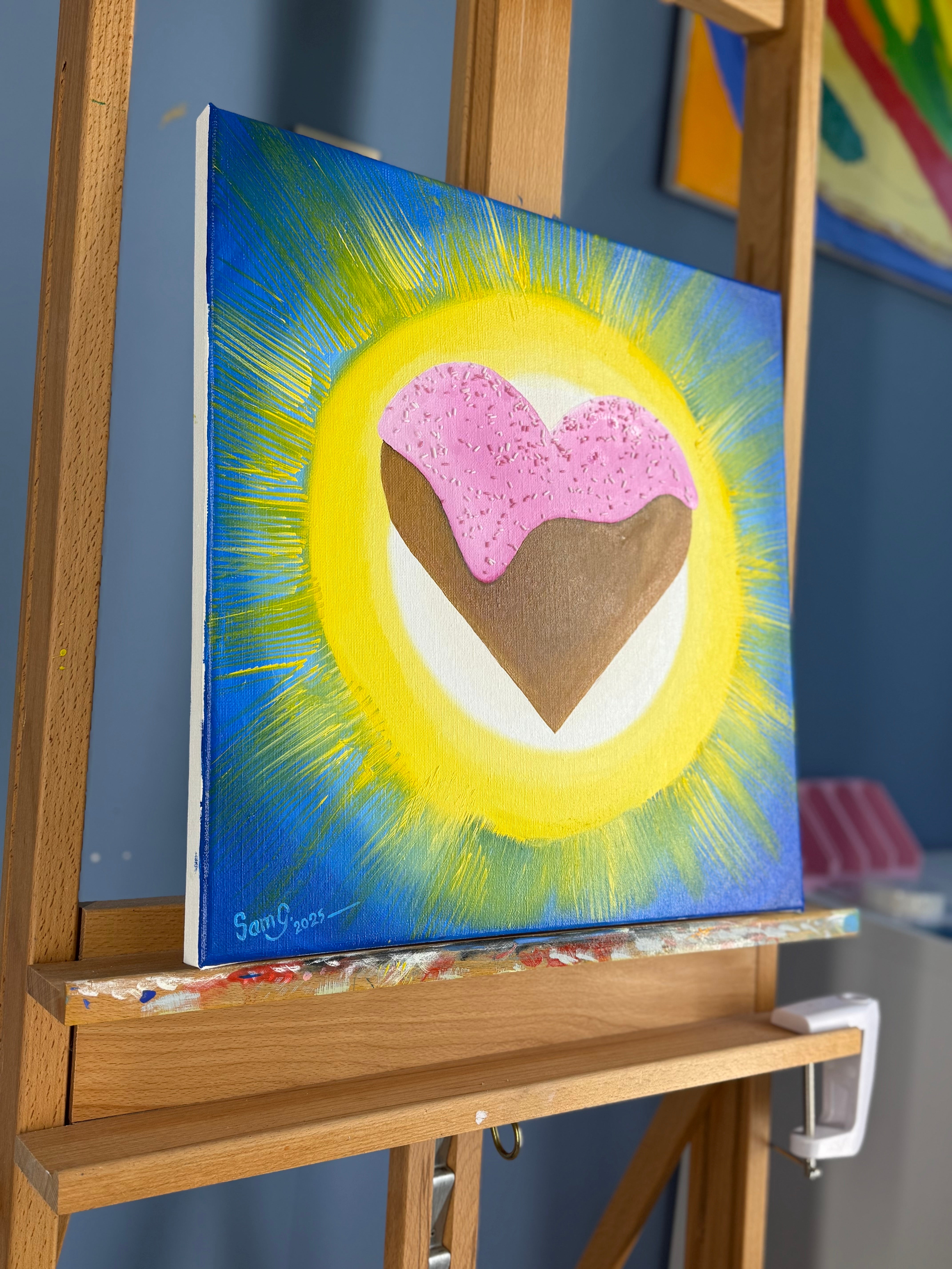 This heart doesn’t just shine—it glazes. Sprinkles is part donut, part sculpture, part daydream. With real texture in the frosting and a strawberry glaze that looks good enough to eat, this piece plays with the boundary between painting and object. It’s sweet on the surface, but there’s more underneath: a study in indulgence, nostalgia, and joy you can almost taste. It’s fun. It’s bold. And it doesn’t take itself too seriously.