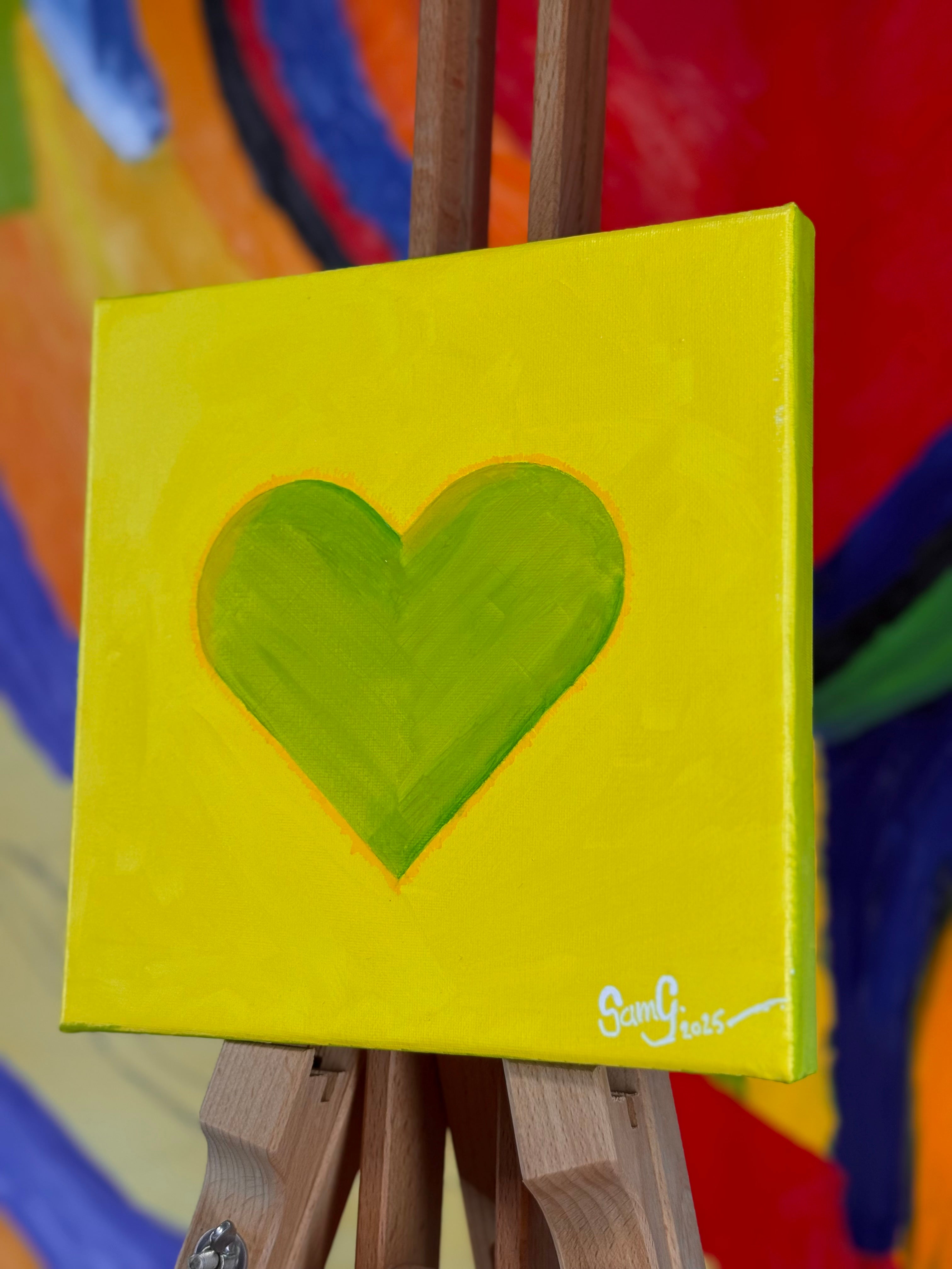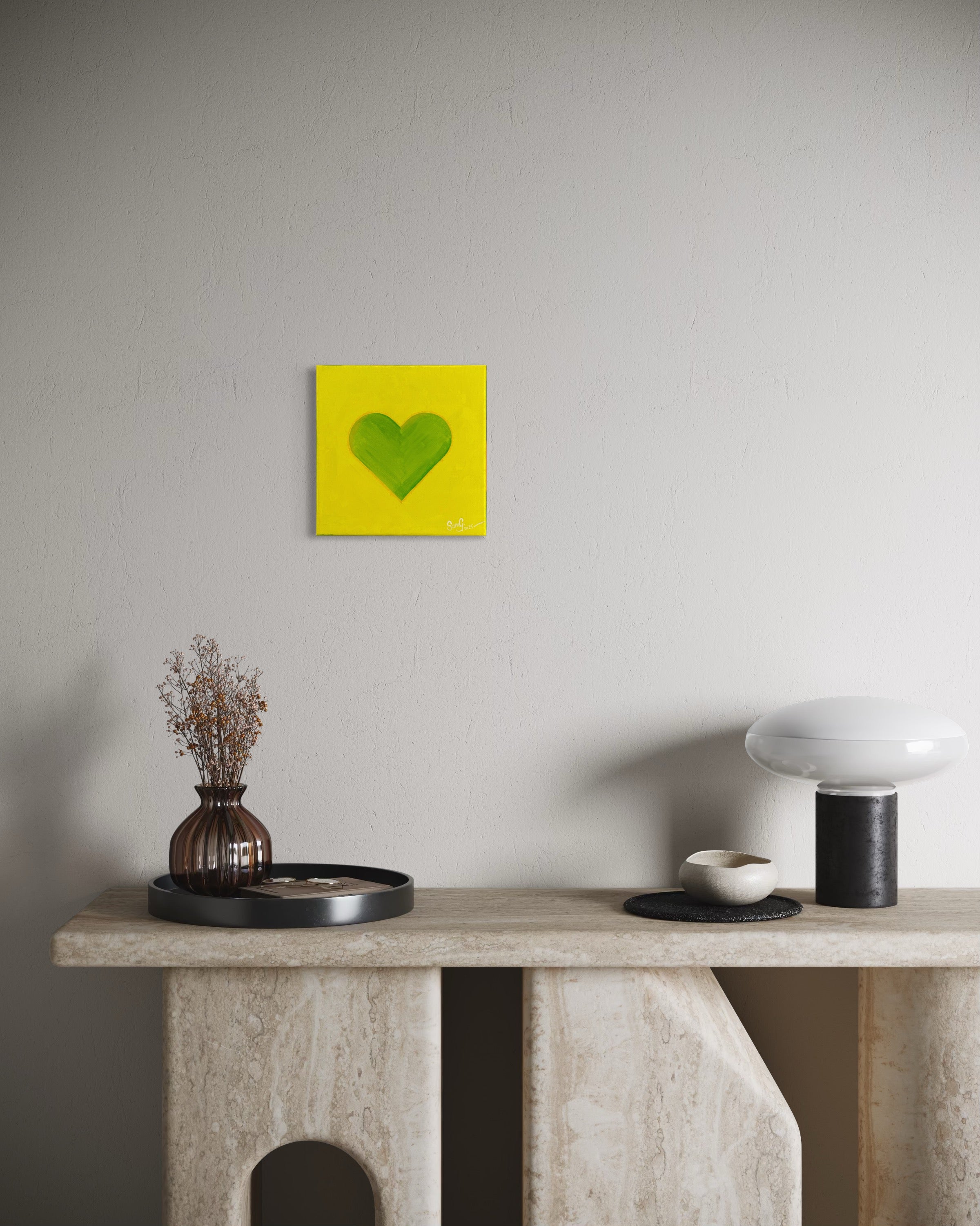 A soft green heart floats over a bright yellow background, like fresh grass under full sun. In this small-format piece, part of the Exploration series, the shape of the heart is shifting—rounder, looser, more relaxed. It feels like a moment of ease. A smile in color. Painted in the warmth of summer, this work captures the simple joy of light, air, and time unhurried. A study in shape, and in mood.