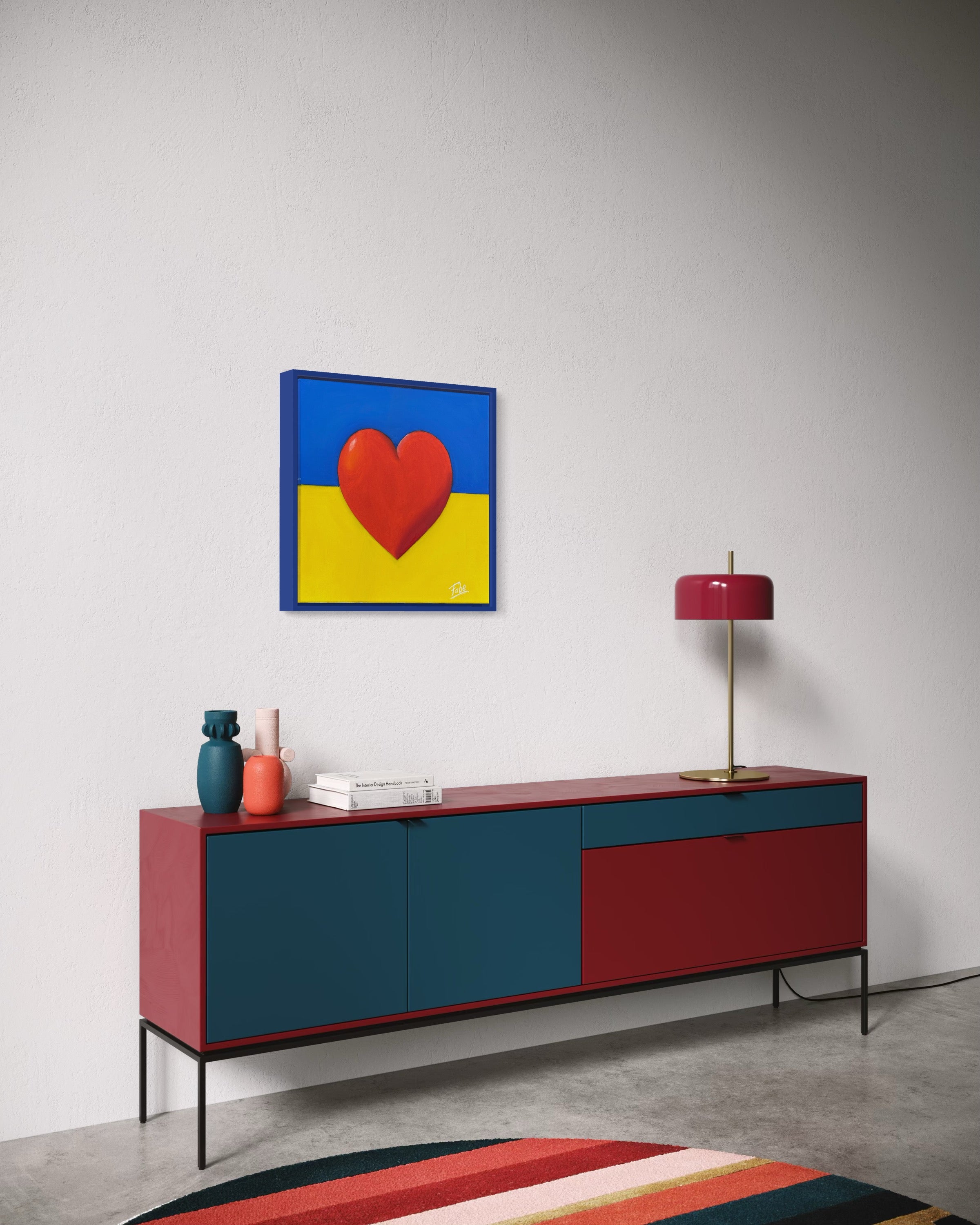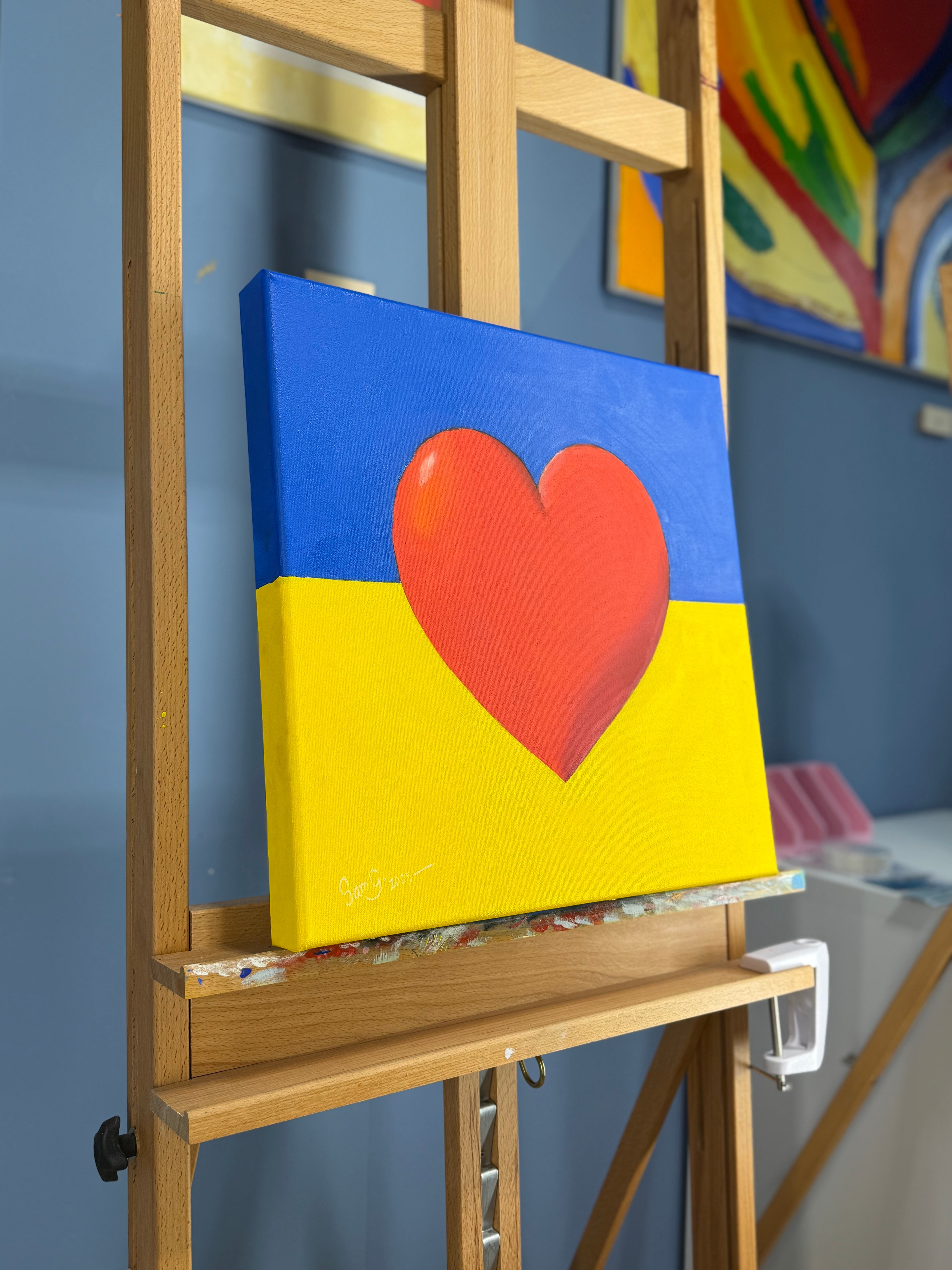 A bright red heart rises from the center of a divided blue and yellow field—the unmistakable colors of the Ukrainian flag. This painting is a symbol of resilience, love, and solidarity. It doesn’t try to explain or justify; it simply stands. A quiet but resolute message of support for all those living through war, displacement, and fear. In the face of destruction, this heart speaks of care. Of humanity. Of hope that refuses to die.